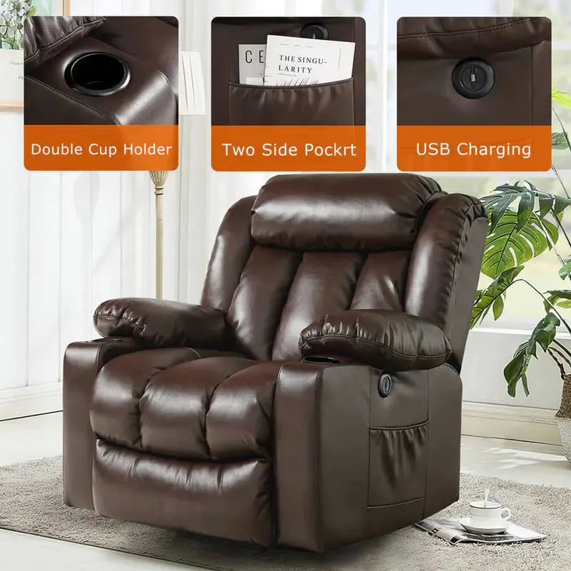 - 【Comfortable And Durable Upholstery】 - Overstuffed backrest and seat cushion will bring you more comfortable, just like the whole body is wrapped up in chair.Soft and smooth leather provides a warm and soft feeling, which is functional for optimal comfort.The extending footrest and reclining feature of this recliner allows you to fully stretch and relax, like reading, sleeping, watching TV.