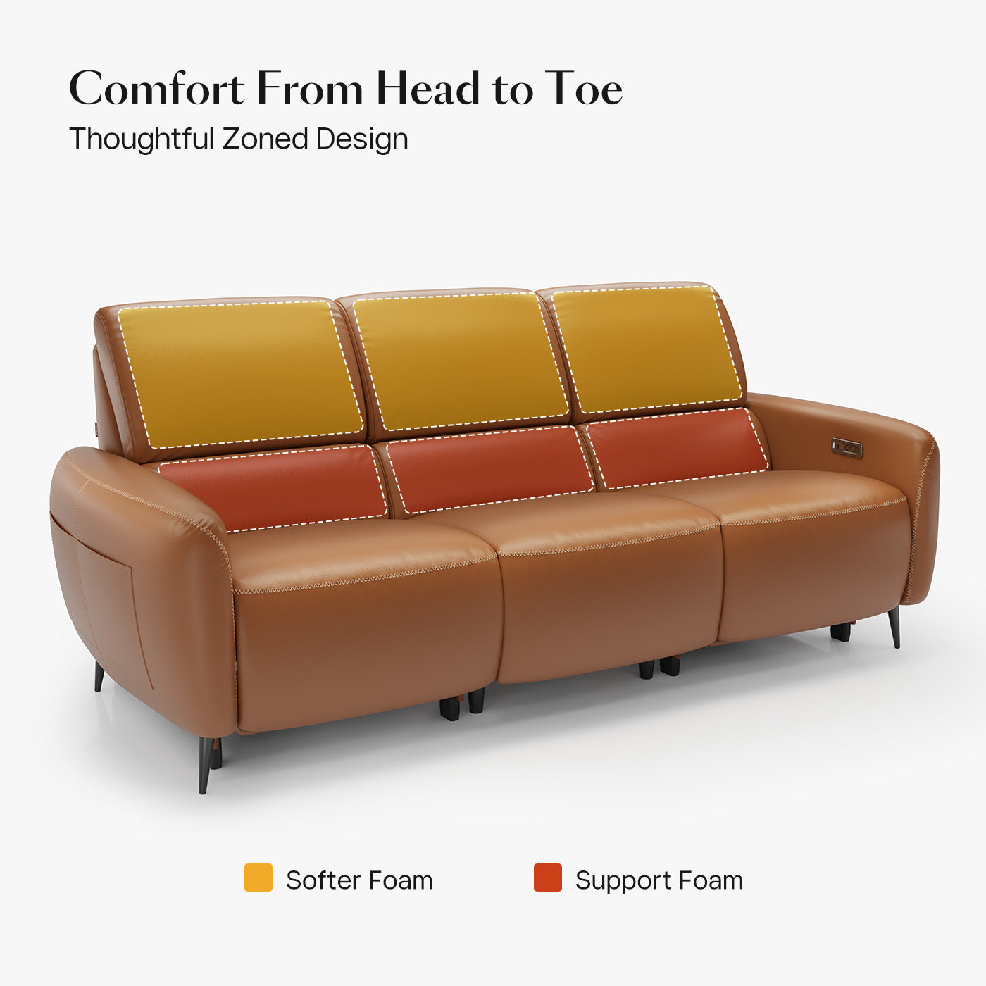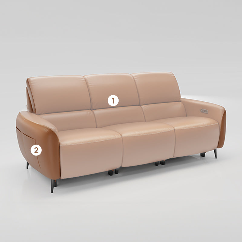 Integrated Power System: The electric system features one outlet that powers the entire 3-seater power recliner sofa, supplying energy for reclining controls and USB and Type-C charging ports on the armrests. Additionally, wireless charging on the drop-down tray keeps all your devices powered effortlessly.